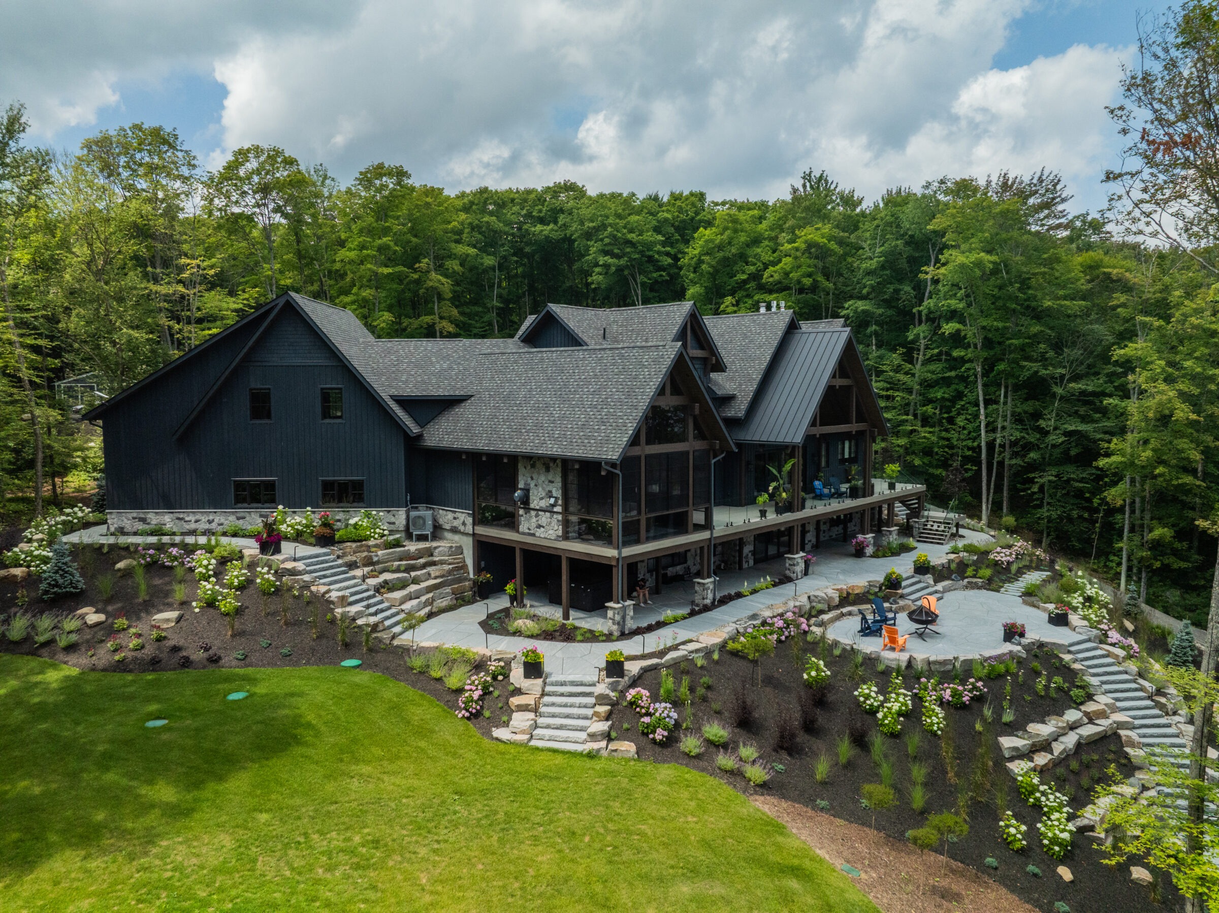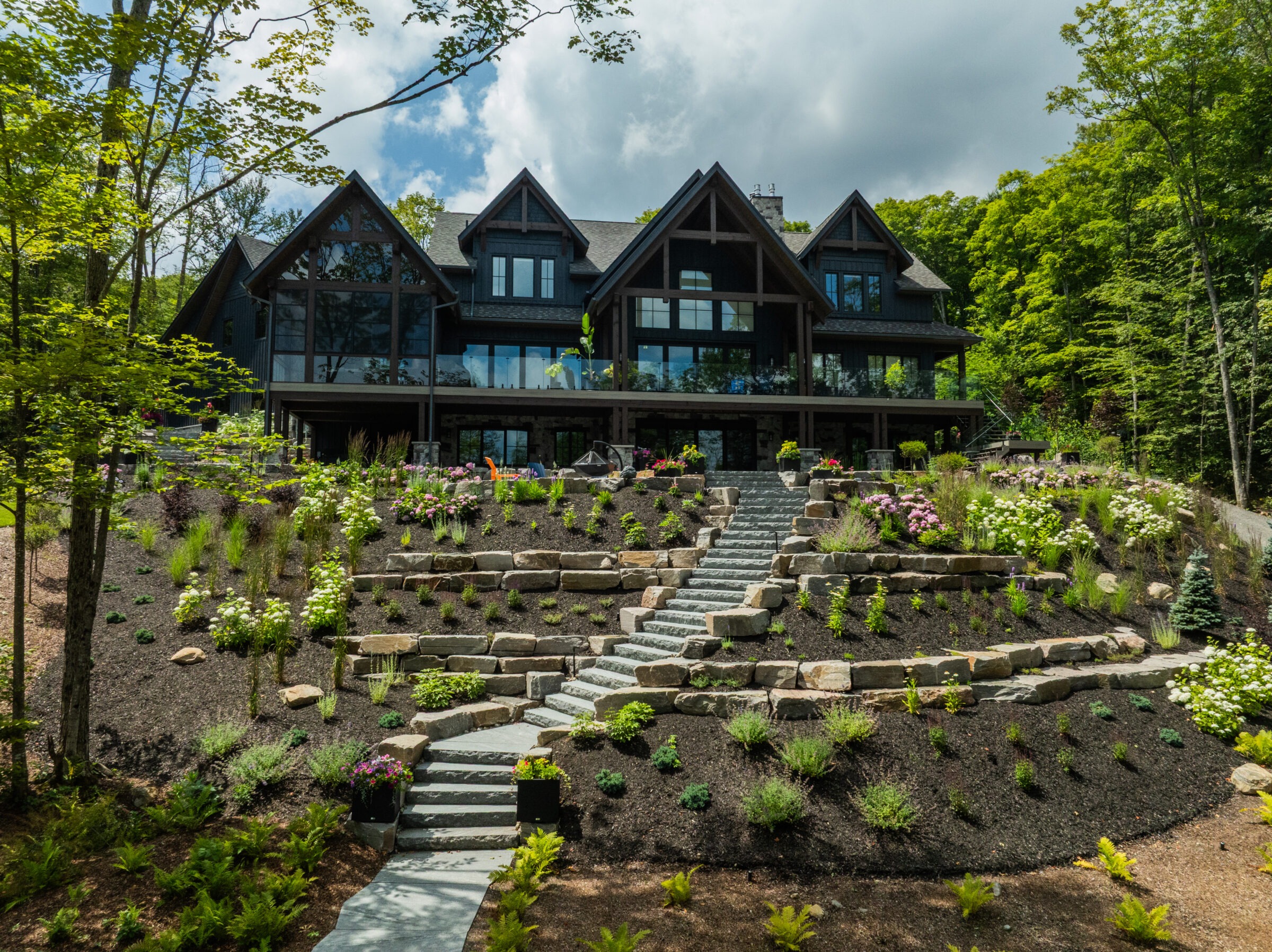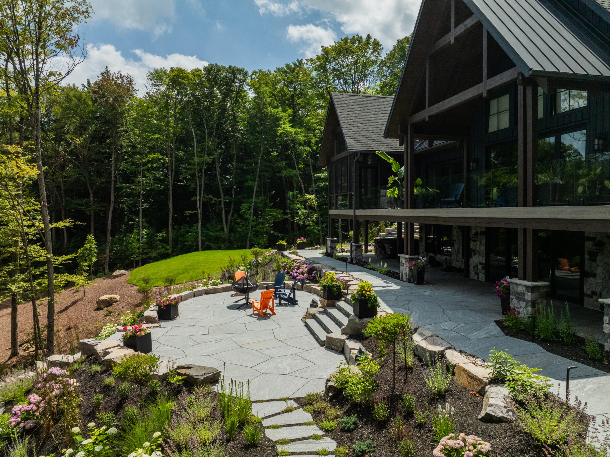 A scenic lakeside view with a winding stone path leading to a wooden dock, surrounded by lush trees and calm water.